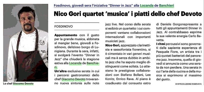"Nico Gori quartet" musica, i piatti dello chef Devoto. Appuntamento con il gusto per la grande musica, abbinata al. mangiar bene...